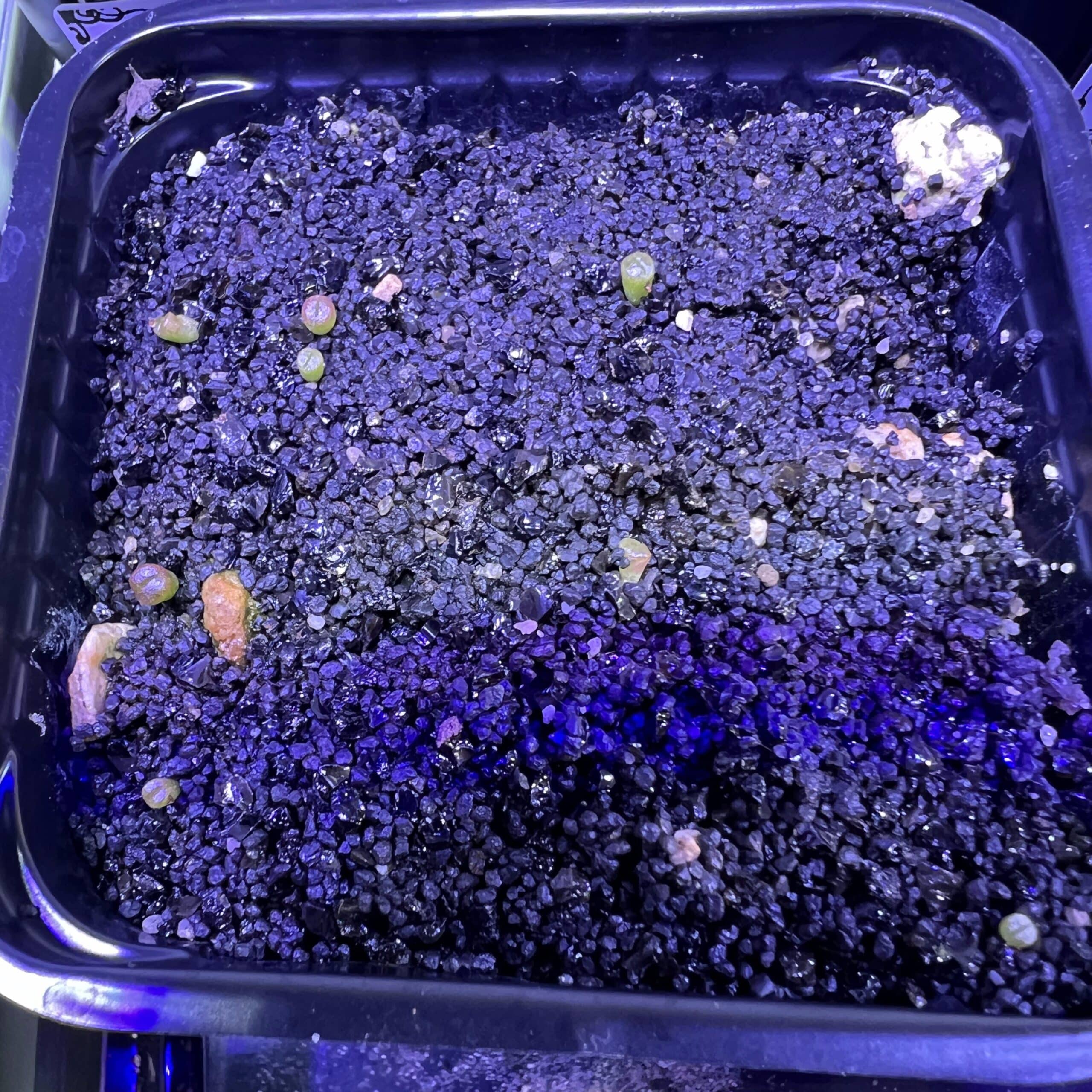 J’ai sortis les pots de leurs sacs de congélation, j’ai trop peur de la pourriture qui semble être un problème sur les semis. Le sable noir que j’ai utilisé est un poil trop gros, les racines ont de la peine à les détourner et je pense que certaines pousses sont tombées à cause de ça. La couleur bleue vient de la lumière qui est normalement faite pour un aquarium récifal, mais en vrai ça paraît moins bleu. On voit quand-même déjà la couleur violette caractéristique sur certains d’entre eux !